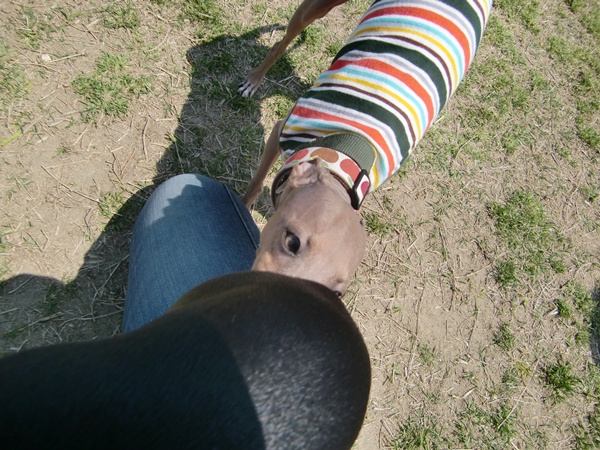 ママの膝の上からドッグランを見守るここな。
